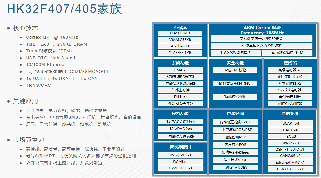 產(chǎn)品簡介: HK32F407 主流型 內(nèi)核與主頻:采用ARM Cortex-M4 內(nèi)核,最高時(shí)鐘頻率達(dá) 168MHz,具備單精度浮點(diǎn)單元 FPU,可高效處理復(fù)雜計(jì)算任務(wù)。 存儲資源:擁有1MB的Flash 和256KB 的SRAM,還配備了64KB的CCM SRAM以及4KB的備份SRAM,大容量的存儲資源能夠滿足多種復(fù)雜應(yīng)用場景下的程序運(yùn)行和數(shù)據(jù)存儲需求。 ADC 與DAC:集成3個(gè)12 位2MSPS ADC 單元,單個(gè)ADC 最多支持19個(gè)通道,可測量16個(gè)外部信號源、2個(gè)內(nèi)部信號源和VBAT 通道的信號,并且支持三ADC 模式,采樣率最高可達(dá)6MSPS;同時(shí)配備2個(gè)12 位DAC。 定時(shí)器:包含2個(gè)高級定時(shí)器 TIM1/TIM8,具有剎車功能和4路PWM輸出,其中3路帶死區(qū)互補(bǔ)輸出;10個(gè)通用定時(shí)器TIM2~5和TIM9~14,其中TIM3~4和TIM9~14為16位通用定時(shí)器,TIM2/TIM5為32位通用定時(shí)器;以及2個(gè)基本定時(shí)器TIM6/TIM7。 通信接口:具備豐富的通信接口,包括4個(gè)USART、最多4 個(gè)UART、3個(gè)SPI(均支持 I2S 協(xié)議)、3個(gè)I2C、1個(gè)SDIO、2個(gè)CAN、1個(gè)QSPI、1個(gè)USB OTG HS 和1個(gè)以太網(wǎng)接口。 工作溫度與電壓范圍:工作溫度范圍為- 40℃~105℃,工作電壓范圍為主電源 VDD 為1.8V~3.6V、備份電源VBAT 為 1.8V~3.6V。