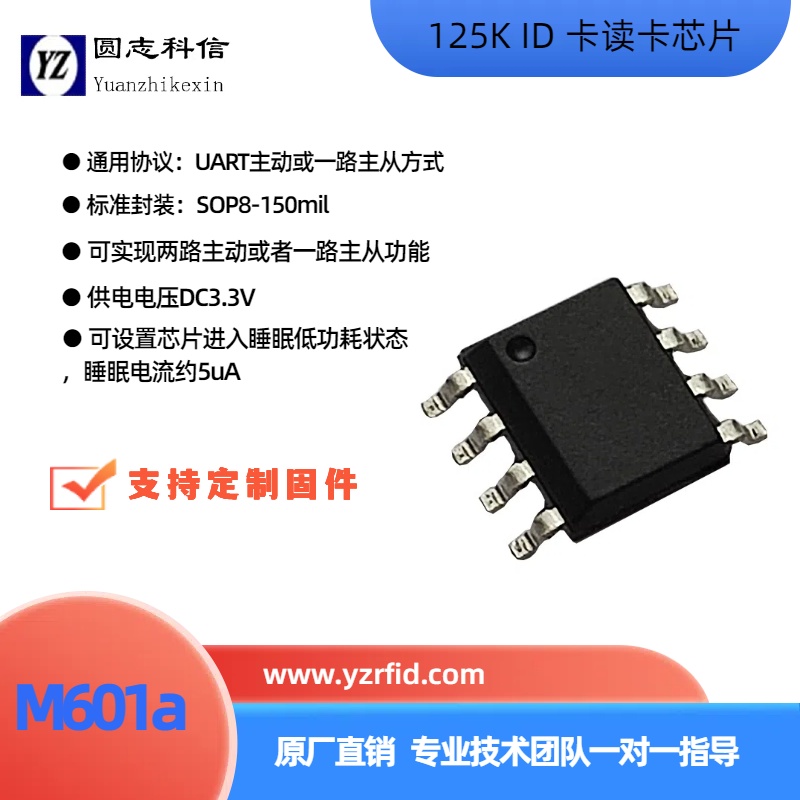 產品簡介: >>產品描述 ? 簡單的命令可完成對125K ID卡片的讀取 ? 外圍電路簡單 ? 無需外接晶振,進一步減小外圍器件數量 ? 可實現兩路主動或者一路主從功能 ? 供電DC3.3V ? 支持125K ID卡:EM4001/TK4001/EM4100/TK4100及其兼容卡片 ? 讀卡距離: 以天線尺寸44*20mm為例:標準卡約為55mm 鑰匙扣卡/水滴卡約25mm 不同天線尺寸,不同標簽卡片,尺寸不同,讀卡距離會不同,以實際測試為準 ? 適用于PC機或UART的單片機,默認波特率9600BPS ? 封裝:SOP8-150mil,特別適合對空間要求嚴格的地方 ? 配以專用的IC-M601評估板,可實現用戶應用快速開發(fā),以達到自己產品短時間進入市場的目的 ? 目前廣泛應用于門禁考勤,汽車電子感應鎖配套,辦公商場/洗浴中心儲物箱的安全控制,各種防偽系統(tǒng)及生產過程控制