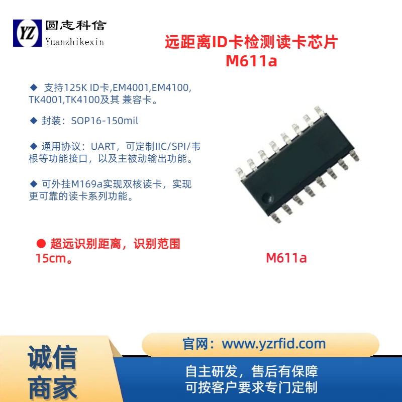 產品簡介: >>產品描述 ? 簡單的命令可完成對125K ID卡片的讀取 ? 外圍電路簡單 ? 小功率讀卡,內部優(yōu)化算法實現高靈敏度讀卡,識別距離較遠 ? 可外掛M169a實現雙核讀卡,實現更可靠的讀卡 ? 外掛4M工業(yè)級晶振,使讀卡距離穩(wěn)定性更好 ? 支持125K ID卡:EM4001/TK4001/EM4100/TK4100及其兼容卡片 ? 適用于PC機或UART的單片機,默認波特率19200BPS ? 讀卡距離10~150mm與配套天線和卡片有關,整體讀卡距離優(yōu)于M601a ? 可定制IIC/SPI/韋根等功能接口,以及主被動輸出功能 ? 封裝:SOP16 ? 配以專用的IC-M611a評估板,可實現用戶應用快速開發(fā),以達到短時間進入市場的目的 ? 目前廣泛應用于門禁考勤,汽車電子感應鎖配套,辦公商場/洗浴中心儲物箱的安全控制,各種防偽系統(tǒng)及生產過程控制