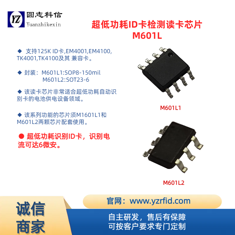 產品簡介: >>產品描述 ? 支持125K各類低頻卡,普通只讀ID卡: EM4001/TK4001/EM4100/TK4100及其兼容卡片 ? 超低功耗識別ID卡,識別電流可達6微安 ? SOT23-6+SOP8封裝 ? 無需外接晶振,進一步減小外圍器件數量 ? 配以專用的M601L評估板,可實現用戶應用快速開發(fā),以達到短時間進入市場的目的