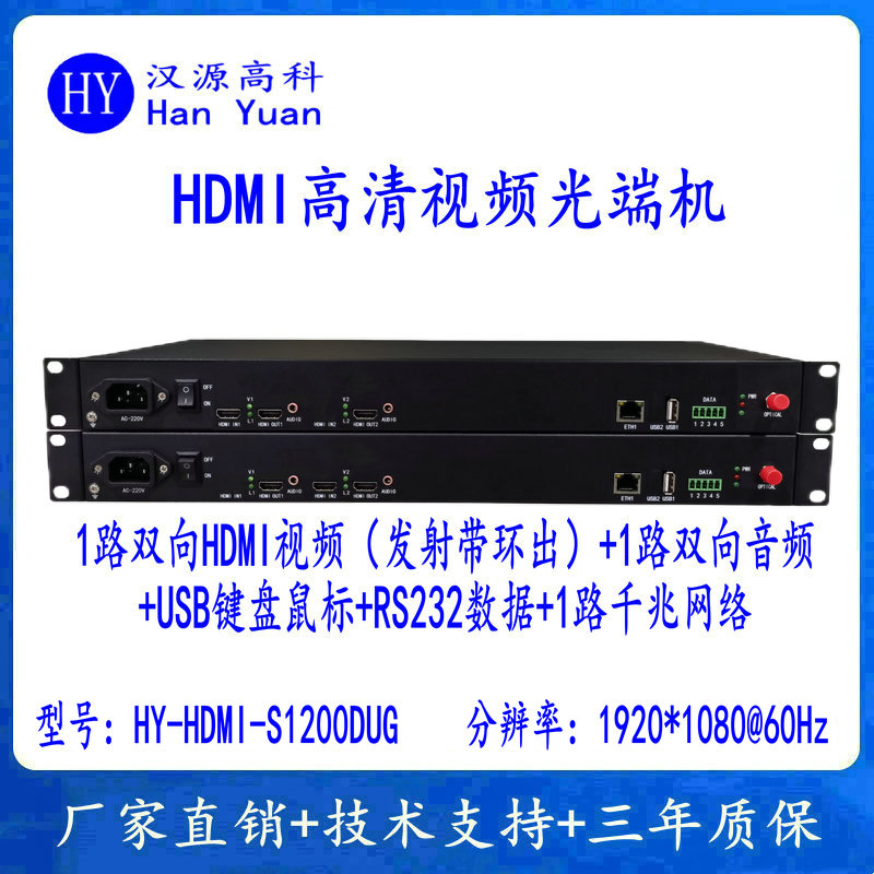 產(chǎn)品簡(jiǎn)介: 1路雙向HDMI視頻+1路雙向音頻+RS232數(shù)據(jù)+USB鼠標(biāo)鍵盤+1路千兆網(wǎng)絡(luò)HDMI高清視頻光端機(jī)HY-HDMI-S1200DUG是漢源高科(北京)科技有限公司自主研發(fā)產(chǎn)品的一款產(chǎn)品,HDMI光端機(jī)是由HDMI發(fā)射端和HDMI接收端組成,通過(guò)一芯單模光纖傳輸HDMI高清音視頻信號(hào)。在多媒體應(yīng)用系統(tǒng)中,往往需要把HDMI數(shù)字視頻信號(hào)進(jìn)行遠(yuǎn)距離、無(wú)失真的并行傳輸。但使用普通的電纜長(zhǎng)距離傳輸時(shí),總會(huì)出現(xiàn)輸出信號(hào)差,容易受干擾,顯示出來(lái)的圖像會(huì)出現(xiàn)模糊、拖尾、分色等現(xiàn)象。同時(shí)傳輸距離短,要多條電纜才能同時(shí)傳輸這些信號(hào),不能滿足多媒體信息發(fā)布等場(chǎng)合長(zhǎng)距離傳輸?shù)囊?,使用漢源高科1路雙向HDMI高清視頻光端機(jī)HY-HDMI-S1200DUG進(jìn)行傳輸,很好的解決了此類問題,設(shè)備具有具有傳輸距離遠(yuǎn)(0~80km)、頻帶寬、抗干擾性能強(qiáng)、安全性能高等優(yōu)點(diǎn),適用于長(zhǎng)距離和特殊環(huán)境傳輸。,所以在長(zhǎng)距離傳輸和特殊環(huán)境等方面具有無(wú)法比擬優(yōu)勢(shì)。