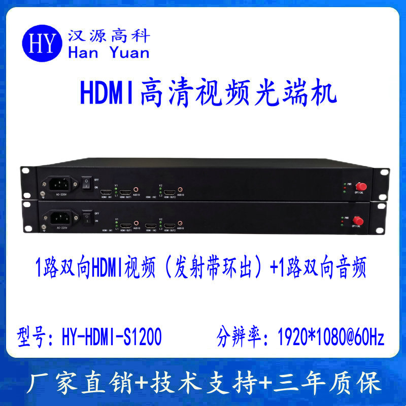 產(chǎn)品簡(jiǎn)介: 1路雙向HDMI視頻+1路雙向音頻+USB鼠標(biāo)鍵盤 HDMI高清視頻光端機(jī)HY-HDMI-S1200U是漢源高科(北京)科技有限公司自主研發(fā)產(chǎn)品的一款產(chǎn)品,HDMI光端機(jī)是由HDMI發(fā)射端和HDMI接收端組成,通過(guò)一芯單模光纖傳輸HDMI高清音視頻信號(hào)。在多媒體應(yīng)用系統(tǒng)中,往往需要把HDMI數(shù)字視頻信號(hào)進(jìn)行遠(yuǎn)距離、無(wú)失真的并行傳輸。但使用普通的電纜長(zhǎng)距離傳輸時(shí),總會(huì)出現(xiàn)輸出信號(hào)差,容易受干擾,顯示出來(lái)的圖像會(huì)出現(xiàn)模糊、拖尾、分色等現(xiàn)象。同時(shí)傳輸距離短,要多條電纜才能同時(shí)傳輸這些信號(hào),不能滿足多媒體信息發(fā)布等場(chǎng)合長(zhǎng)距離傳輸?shù)囊?,使用漢源高科1路雙向HDMI高清視頻光端機(jī)HY-HDMI-S1200U進(jìn)行傳輸,很好的解決了此類問題,設(shè)備具有具有傳輸距離遠(yuǎn)(0~80km)、頻帶寬、抗干擾性能強(qiáng)、安全性能高等優(yōu)點(diǎn),適用于長(zhǎng)距離和特殊環(huán)境傳輸。,所以在長(zhǎng)距離傳輸和特殊環(huán)境等方面具有無(wú)法比擬優(yōu)勢(shì)。