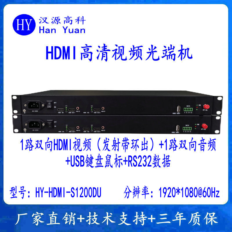 產(chǎn)品簡(jiǎn)介: 2路雙向HDMI視頻+2路雙向音頻+RS232數(shù)據(jù)+USB鼠標(biāo)鍵盤+1路千兆網(wǎng)絡(luò)HDMI高清視頻光端機(jī)HY-HDMI-S2200DUG是漢源高科(北京)科技有限公司自主研發(fā)產(chǎn)品的一款產(chǎn)品,HDMI光端機(jī)是由HDMI發(fā)射端和HDMI接收端組成,通過(guò)一芯單模光纖傳輸HDMI高清音視頻信號(hào)。在多媒體應(yīng)用系統(tǒng)中,往往需要把HDMI數(shù)字視頻信號(hào)進(jìn)行遠(yuǎn)距離、無(wú)失真的并行傳輸。但使用普通的電纜長(zhǎng)距離傳輸時(shí),總會(huì)出現(xiàn)輸出信號(hào)差,容易受干擾,顯示出來(lái)的圖像會(huì)出現(xiàn)模糊、拖尾、分色等現(xiàn)象。同時(shí)傳輸距離短,要多條電纜才能同時(shí)傳輸這些信號(hào),不能滿足多媒體信息發(fā)布等場(chǎng)合長(zhǎng)距離傳輸?shù)囊?,使用漢源高科2路雙向HDMI高清視頻光端機(jī)HY-HDMI-S2200DUG進(jìn)行傳輸,很好的解決了此類問題,設(shè)備具有具有傳輸距離遠(yuǎn)(0~80km)、頻帶寬、抗干擾性能強(qiáng)、安全性能高等優(yōu)點(diǎn),適用于長(zhǎng)距離和特殊環(huán)境傳輸。,所以在長(zhǎng)距離傳輸和特殊環(huán)境等方面具有無(wú)法比擬優(yōu)勢(shì)。