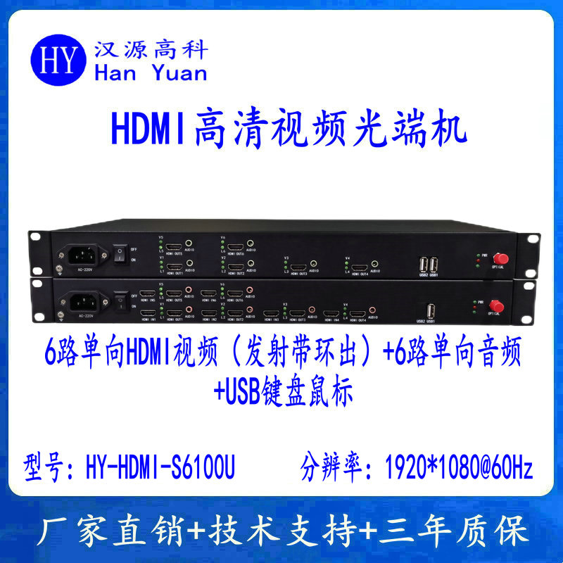 產(chǎn)品簡介: 6路單向HDMI視頻(發(fā)射機(jī)帶環(huán)出)+6路單向音頻+USB鼠標(biāo)鍵盤+1路千兆網(wǎng)絡(luò)HDMI高清視頻光端機(jī)HY-HDMI-S6100UG是漢源高科(北京)科技有限公司自主研發(fā)產(chǎn)品的一款產(chǎn)品,HDMI光端機(jī)是由HDMI發(fā)射端和HDMI接收端組成,通過一芯單模光纖傳輸HDMI高清音視頻信號。在多媒體應(yīng)用系統(tǒng)中,往往需要把HDMI數(shù)字視頻信號進(jìn)行遠(yuǎn)距離、無失真的并行傳輸。但使用普通的電纜長距離傳輸時(shí),總會(huì)出現(xiàn)輸出信號差,容易受干擾,顯示出來的圖像會(huì)出現(xiàn)模糊、拖尾、分色等現(xiàn)象。同時(shí)傳輸距離短,要多條電纜才能同時(shí)傳輸這些信號,不能滿足多媒體信息發(fā)布等場合長距離傳輸?shù)囊?,使用漢源高科6路單向HDMI高清視頻光端機(jī)HY-HDMI-S6100UG進(jìn)行傳輸,很好的解決了此類問題,設(shè)備具有具有傳輸距離遠(yuǎn)(0~80km)、頻帶寬、抗干擾性能強(qiáng)、安全性能高等優(yōu)點(diǎn),適用于長距離和特殊環(huán)境傳輸。,所以在長距離傳輸和特殊環(huán)境等方面具有無法比擬優(yōu)勢。