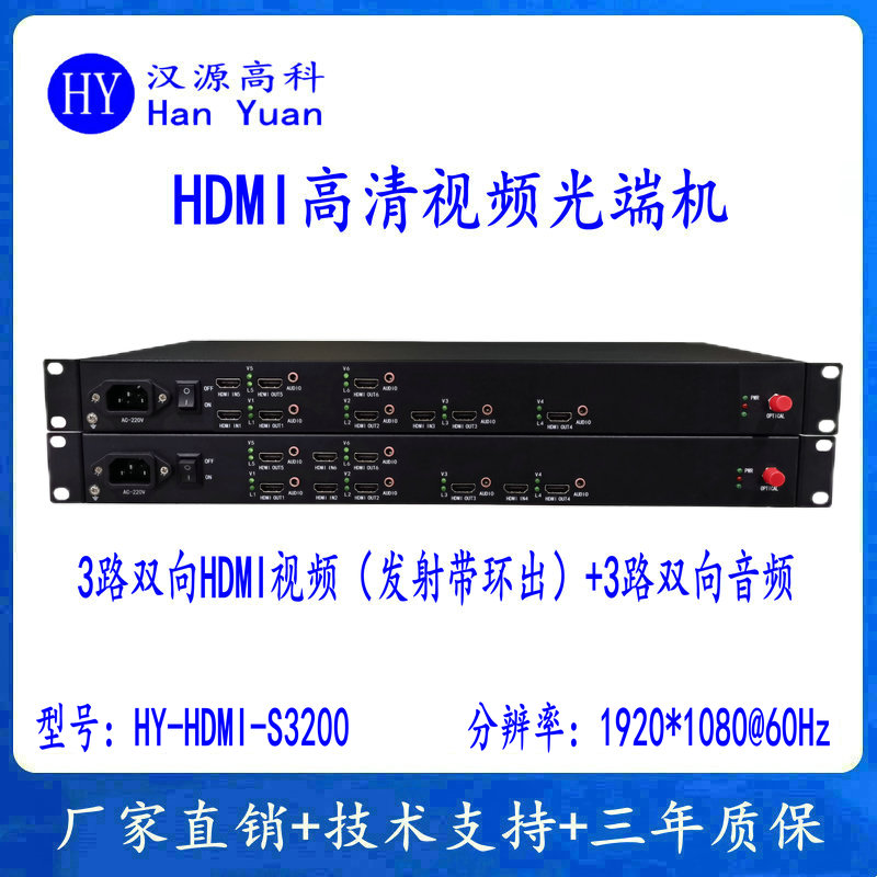 產(chǎn)品簡介: 3路雙向HDMI視頻(發(fā)射機(jī)帶環(huán)出)+3路雙向音頻HDMI高清視頻光端機(jī)HY-HDMI-S3200是漢源高科(北京)科技有限公司自主研發(fā)產(chǎn)品的一款產(chǎn)品,HDMI光端機(jī)是由HDMI發(fā)射端和HDMI接收端組成,通過一芯單模光纖傳輸HDMI高清音視頻信號。在多媒體應(yīng)用系統(tǒng)中,往往需要把HDMI數(shù)字視頻信號進(jìn)行遠(yuǎn)距離、無失真的并行傳輸。但使用普通的電纜長距離傳輸時(shí),總會(huì)出現(xiàn)輸出信號差,容易受干擾,顯示出來的圖像會(huì)出現(xiàn)模糊、拖尾、分色等現(xiàn)象。同時(shí)傳輸距離短,要多條電纜才能同時(shí)傳輸這些信號,不能滿足多媒體信息發(fā)布等場合長距離傳輸?shù)囊?,使用漢源高科3路雙向HDMI高清視頻光端機(jī)HY-HDMI-S3200進(jìn)行傳輸,很好的解決了此類問題,設(shè)備具有具有傳輸距離遠(yuǎn)(0~80km)、頻帶寬、抗干擾性能強(qiáng)、安全性能高等優(yōu)點(diǎn),適用于長距離和特殊環(huán)境傳輸,所以在長距離傳輸和特殊環(huán)境等方面具有無法比擬優(yōu)勢。