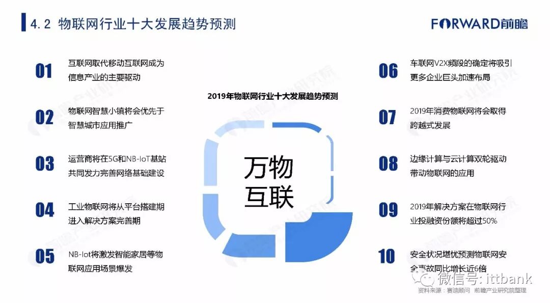 近日,前瞻產(chǎn)業(yè)研究院發(fā)布了《2019年物聯(lián)網(wǎng)行業(yè)市場(chǎng)研究報(bào)告》,對(duì)物聯(lián)網(wǎng)行業(yè)發(fā)展環(huán)境、現(xiàn)狀、產(chǎn)業(yè)鏈、前景及趨勢(shì)進(jìn)行深度分析,整理出了物聯(lián)網(wǎng)產(chǎn)業(yè)鏈全景圖譜、2018年世界物聯(lián)網(wǎng)排行榜500強(qiáng)以及預(yù)測(cè)了2019年物聯(lián)網(wǎng)行業(yè)十大發(fā)展趨勢(shì)。下面一起看看完整PPT: